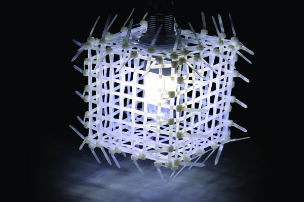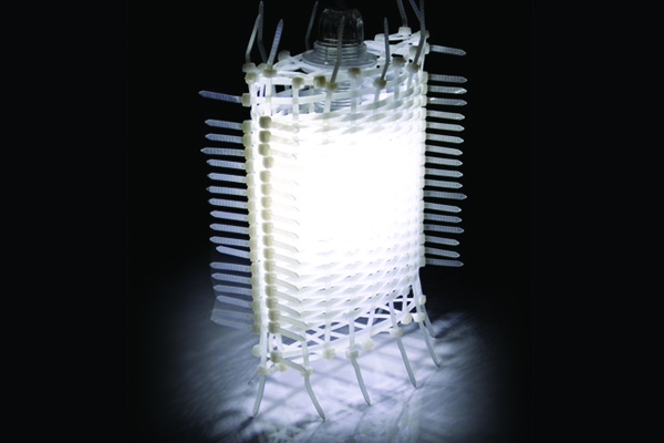 Solo dopo essermi avvicinato a quegli strani oggetti, che sembravano quasi delle meduse immerse nel profondo oceano – l’allestimento dello stand nella zona delle lampade era totalmente nero – ho capito che cosa erano : corpi illuminanti realizzati con fascette da elettricista!!